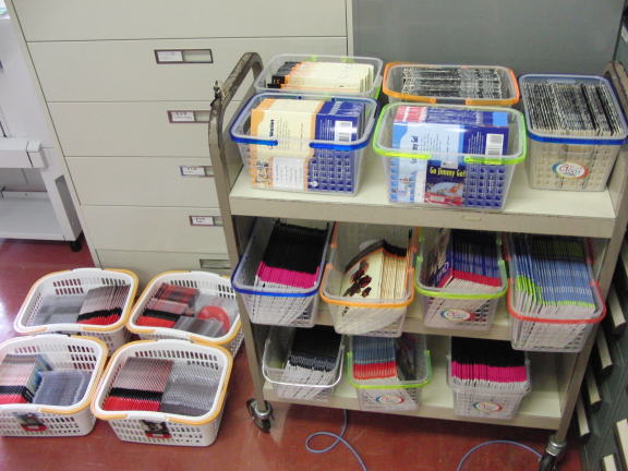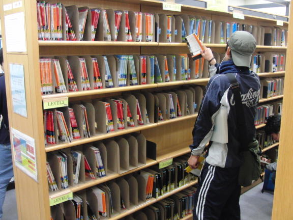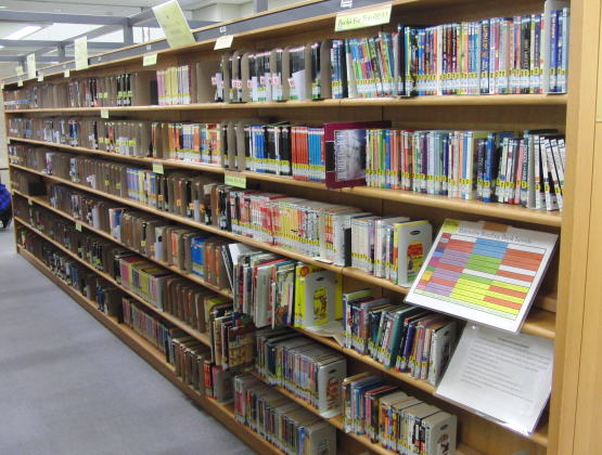 The graded readers in the reserve section of the library, classified and color-coded by level.  Now has over 12000 volumes and is still climbing….