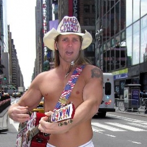 It was January in Manhattan. It was a mild, sunny day. A man stood at 42nd Street and Broadway. His blond hair hung down to his broad shoulders. He was wearing a cowboy hat. He was wearing cowboy boots. He was wearing tight, white underwear. He wasn't wearing a shirt. He wasn't wearing pants. Written on the back of his white underwear was "The Naked Cowboy." He was playing his guitar. People stopped to look at him. A young couple looked at him. The woman was laughing. She said something to her boyfriend. She said something to the cowboy. He waved her over. She walked over to him. He put his muscular arm around her. Her boyfriend took a picture. She gave the cowboy a $5 bill. He put it into his guitar. Another woman walked over to him. He put his arm around her. Her friend took their picture.
